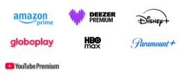 Selecione uma assinatura de streaming que mais combina com você: Amazon Prime, Deezer Premium, Disney+, Globoplay, HBO Max ou YouTube Premium. Aproveite onde estiver!